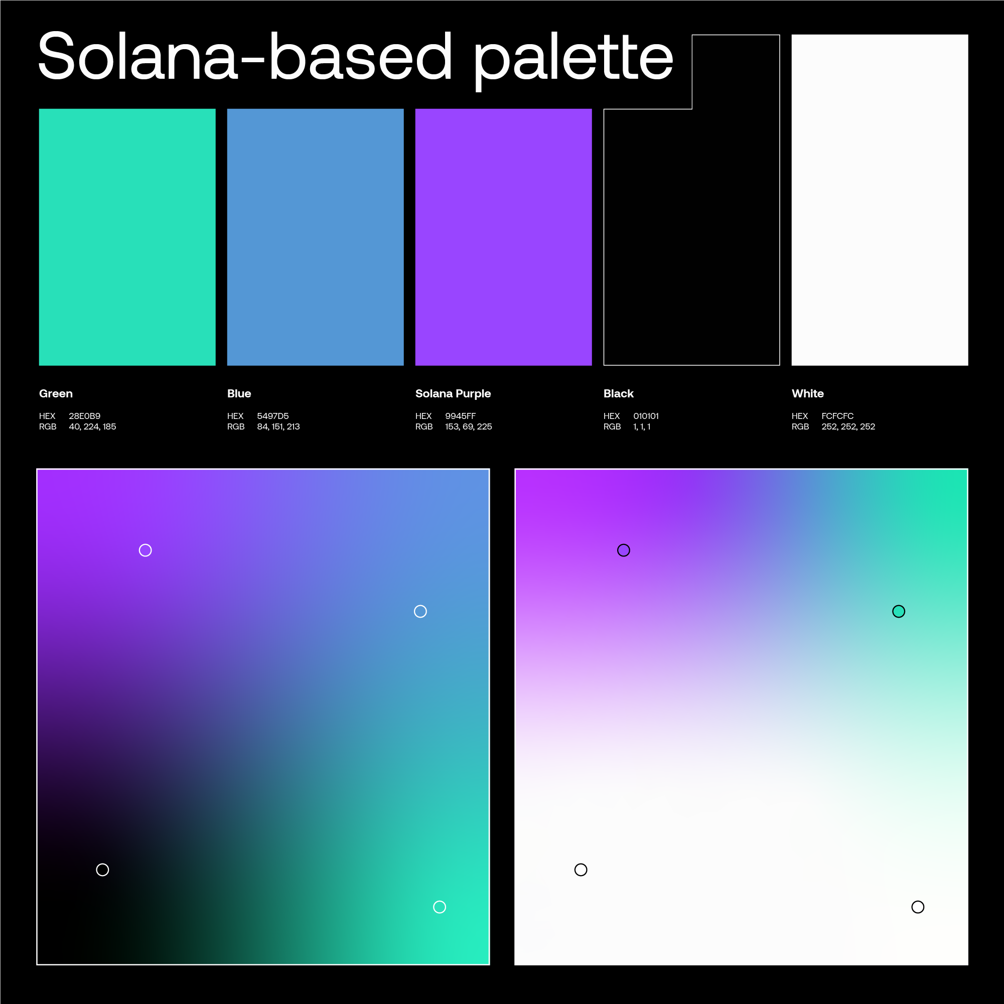 Primary colors and tones rooted in the Solana ecosystem, ensuring continuity and brand alignment. The typeface is bold, clear, and highly legible, with flexibility for adaptation across different assets.